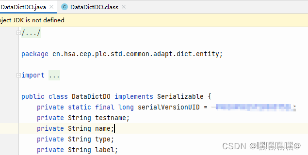 2、在打开的项目中找到需要修改的class文件,在相同位置新增一个同名的java文件,并将class文件中的内容复制到java文件中,之后根据自己的需要更改java文件中的内容。我需要在实体类中增加一个属性testname: