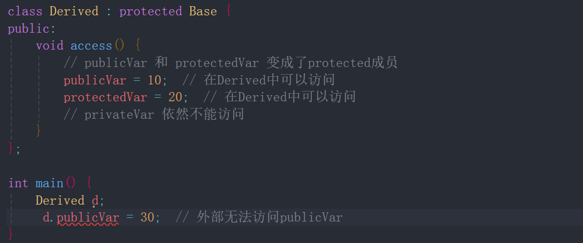 protectedVar = 20; // 在Derived中可以访问