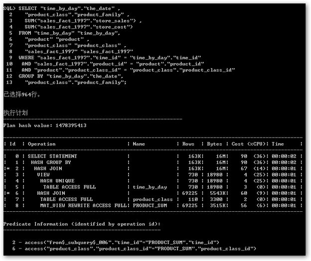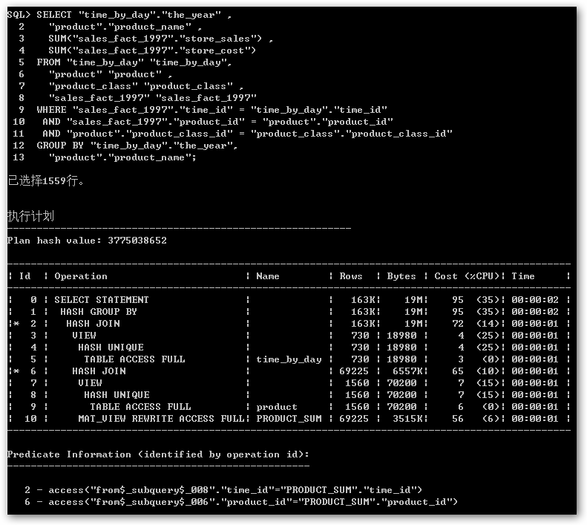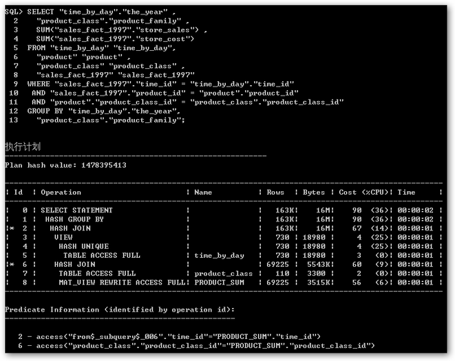 从图一中我们看到,当我们把product 聚合到了最高的level product_family,oracle 的 执行计划是从product_sum 中来做聚合的.这就是因为我们建立的dimension 告诉了oracle product有这种层次的关系.product的dimension 即告诉了product_id 能够决定product_name,也告诉了product_id能够聚合product_family , 同样的我们把Time 聚合到最高的level