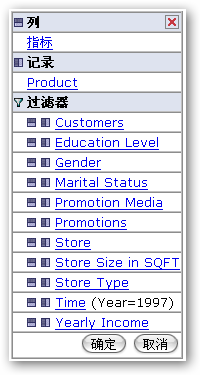 在mondrian 的 foodmart 的例子中,我们可以任意的选取 指标 , product , customers , education leve , gender ,marital sttus ,promotin media ,promotions , store , store size in SQFT , store type , time , yearly income 这十三个要分析的数据来建立cube ,用户有可能使用product 来做分析的维度,也有可能把product 来做Measure 或者不选,所以我们不可能建立所有情况考虑到的Cube .