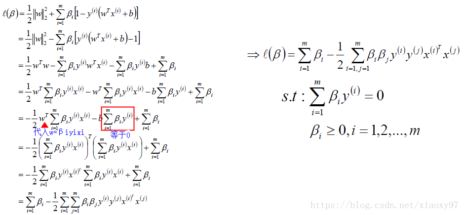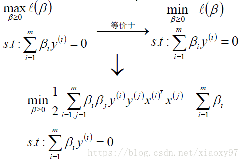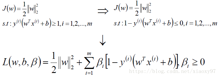 ④将目标函数和约束条件使用KKT条件转换为拉格朗日函数,从而转换为无约束的优化函数。备注:每个样本对应有一个β