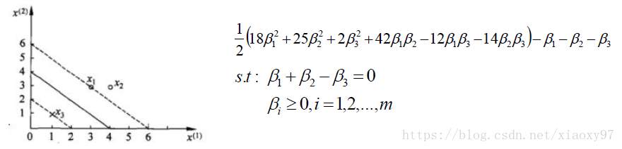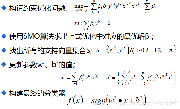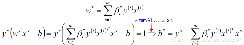 根据求解出的β最优解β*计算w*和b*(一般使用所有支持向量的计算均值来作为实际的b值),(xs,ys)即支持向量: