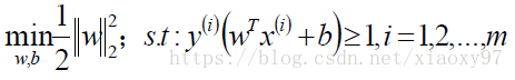 硬间隔:线性划分SVM中的距离度量,在线性划分SVM中,要求函数距离一定是大于1的,最大化硬间隔条件为: