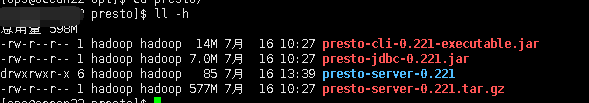 把下载的jar包:presto-cli-0.221-executable.jar 重命名为:presto 并且赋予权限
