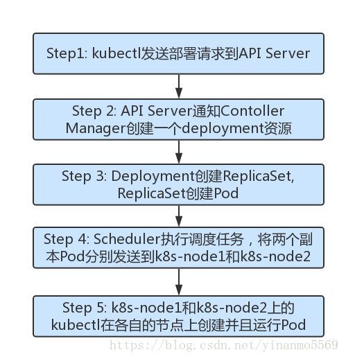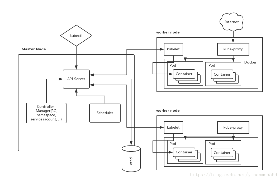 - kubelet与API Server交互。每个Node节点上的kubelet每隔一个时间周期会调用API Server的REST接口报告自身状态,API Server收到这些信息后,将节点信息更新到etcd中。 kubelet也通过API Server的Watch接口监听Pod信息(例如是否需要创建,删除)