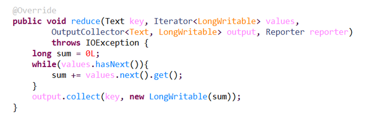 3. 实现reduce方法, 这个方法也有四个参数, 第一个是输入的key, 第二个是输入的 value的迭代器, 可以遍历所有的value,相当于一个列表, outputCollector跟map的一样, 是输出的搜集器, 每次搜集都是key-value的形式, report的作用跟map的相同.