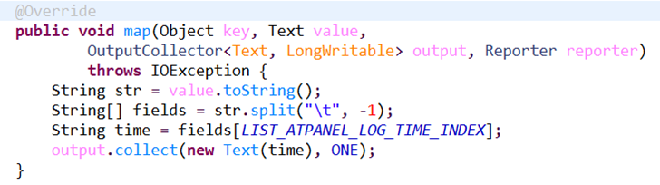 3. 实现map方法, 方法有四个参数, 前面两个就是输入的 Key 和 value, 第三个参数是 OuputCollector, 用于收集输出的, 第四个是reporter,用来报告一些状态的,可以用于debug