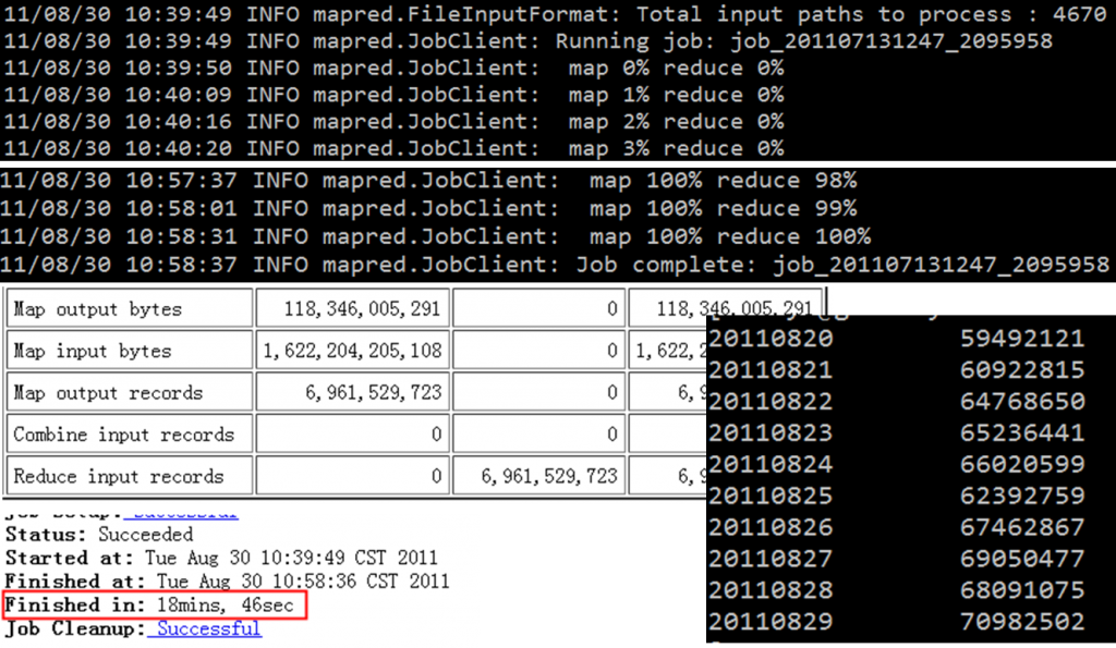 上面部分是hadoop cli客户端显示的进度, 中间是web工具显示的输入输出的一些数据的统计.可以看出, 此次输入数据总共有1.6TB大小, 设计的总记录数为69.6亿. 也就是这份数据记录了该站点的69.6亿的PV. 左下角可以看出, 执行时间比较长, 用了18分钟+46秒.这里慢的原因不在于reduce, 而是我的map的slots太少, 只有300个, 总共一万多个map, 那要分好几百波才能算完map, 所以瓶颈在map这里.右下角是统计的结果数据, 可以看出, 该站点的整体的PV是呈现上升趋势的.