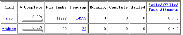 可以看出, 此次输入产生了14292个map,和29个reduce. reduce数这么少是因为我的reduce的slots数只有30, 所以设置为29, 以防一个挂了, 还能在一波reduce中算好.