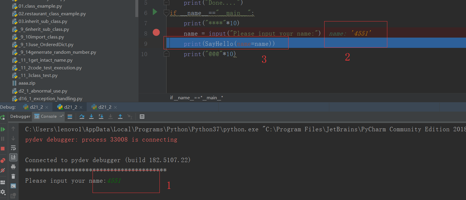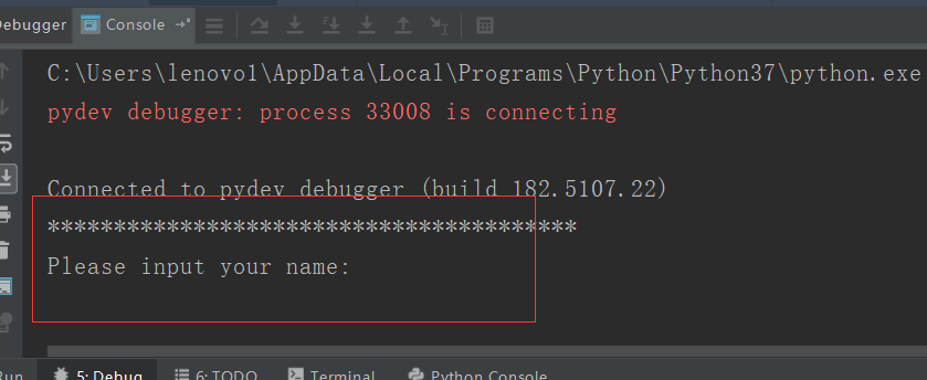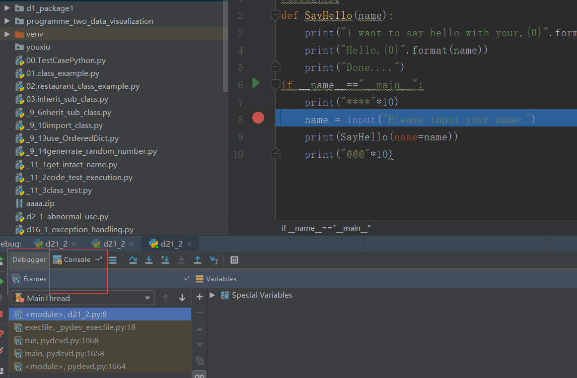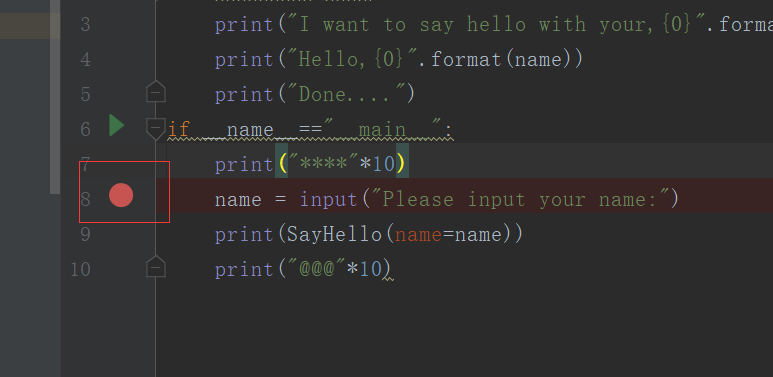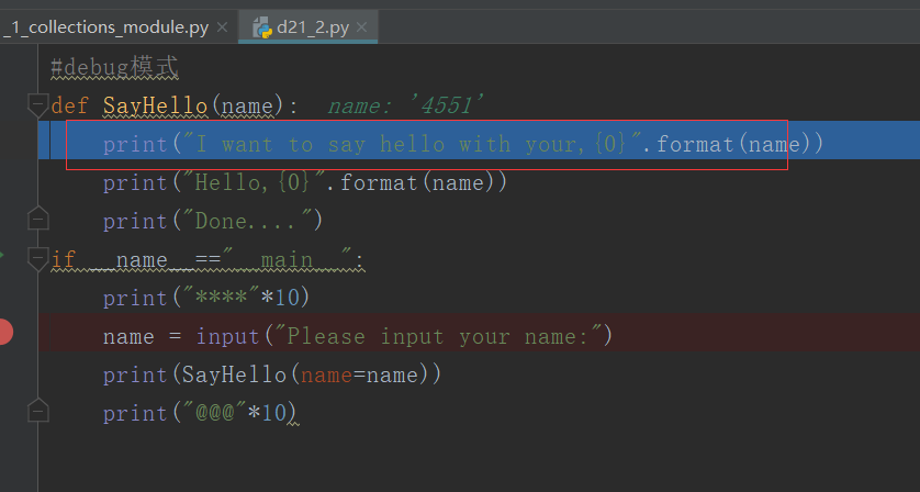 #debug模式def SayHello(name): print("I want to say hello with your,{0}".format(name)) print("Hello,{0}".format(name)) print("Done....")if __name__=="__main__": print("****"*10) name = input("Please input your name:") print(SayHello(name=name)) print("@@@"*10)[url=]