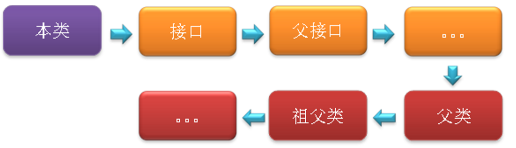 字段解析:对字段进行解析时,会先在本类中查找是否包含有简单名称和字段描述符都与目标相匹配的字段,如果有,则查找结束;如果没有,则会按照继承关系从上往下递归搜索该类所实现的各个接口和它们的父接口,还没有,则按照继承关系从上往下递归搜索其父类,直至查找结束,查找流程如下图所示: