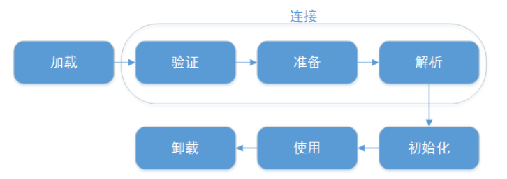 类从加载虚拟机内存中开始到卸载出内存为止,生命周期包括:加载、验证、准备、解析、初始化、使用、卸载。