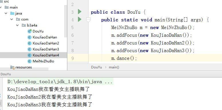 | 01 02 03 04 05 06 07 08 09 10 | public class DouYu { public static void main(String[] args) { MeiNvZhuBo m = new MeiNvZhuBo(); m.addFocus(new KouJiaoDaHan()); m.addFocus(new KouJiaoDaHan2()); m.addFocus(new KouJiaoDaHan3()); m.dance(); } } |
