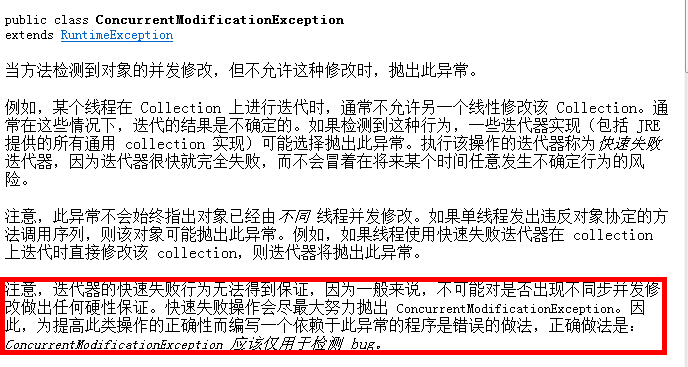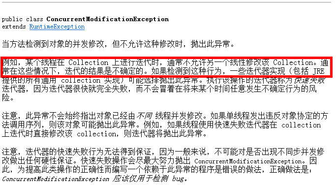 这是因为迭代器遍历集合的时候,让迭代器对元素进行了增删。这也是并发修改异常这个类被设计出来的原因,下面是我从API上截取出来的类的介绍