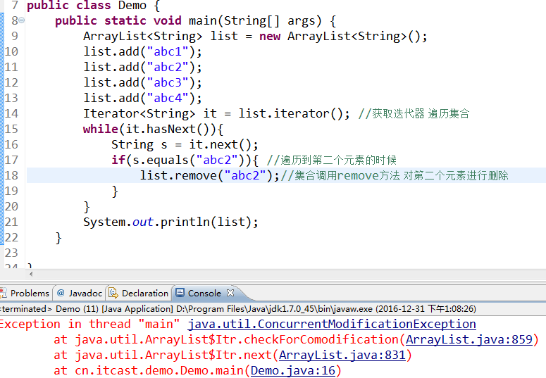 学过基础班的同学估计都知道什么叫并发修改异常,即ConcurrentModificationException,之所以产生这个异常,是因为在迭代器遍历集合的过程中,是不允许集合对元素进行增删的,但却可以用迭代器去增删元素,如果你在迭代器遍历集合的时候,强行让集合对元素进行增删就会产生并发修改异常,比如下面的代码就会产生并发修改异常: