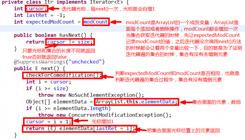 但是JDK中提供的迭代器的源码,并没有如此简单,请大家仔细查看下面的源码,必须明白每一个用红色矩形圈起来的代码的意思。
