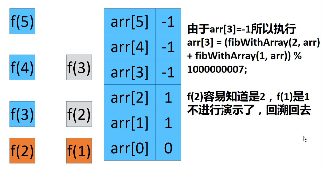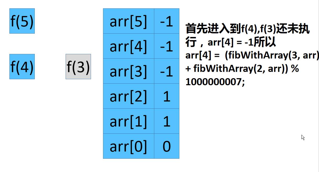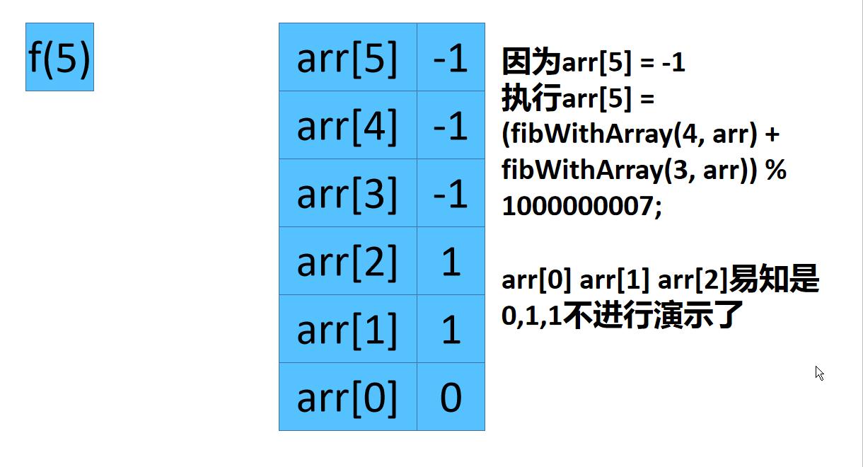小夕:之前我的递归因为存在重复计算的问题,所以我就新开了一个数组,并初始化这个数组都为-1,当这个数组中的值对应是-1呢,那么就执行arr[n] = (fibWithArray(n-1, arr) + fibWithArray(n-2, arr)) % 1000000007;,执行完以后arr[n]就不是-1了,那么下次因为不是-1.所以这个if (arr[n] == -1)判断条件就不满足,所以就直接返回了arr[n],不会存在重复计算的问题!