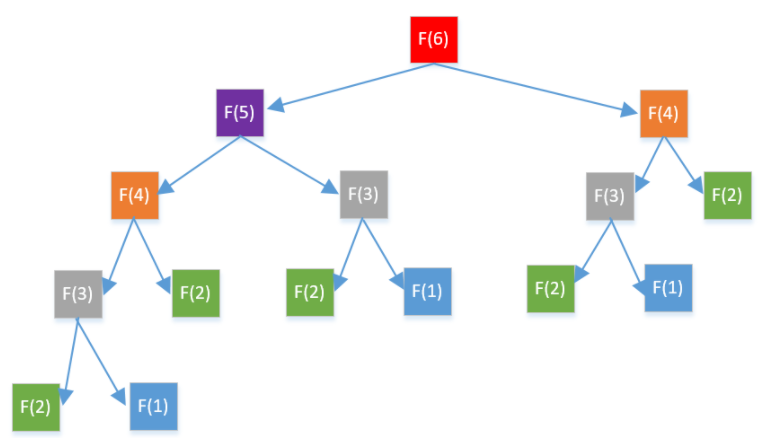 比如计算fib(6),从图片中可以看到,f(3)重复计算了3次,f(4)重复计算了2次,可想而知,越往上,那么重复计算的次数会越多。