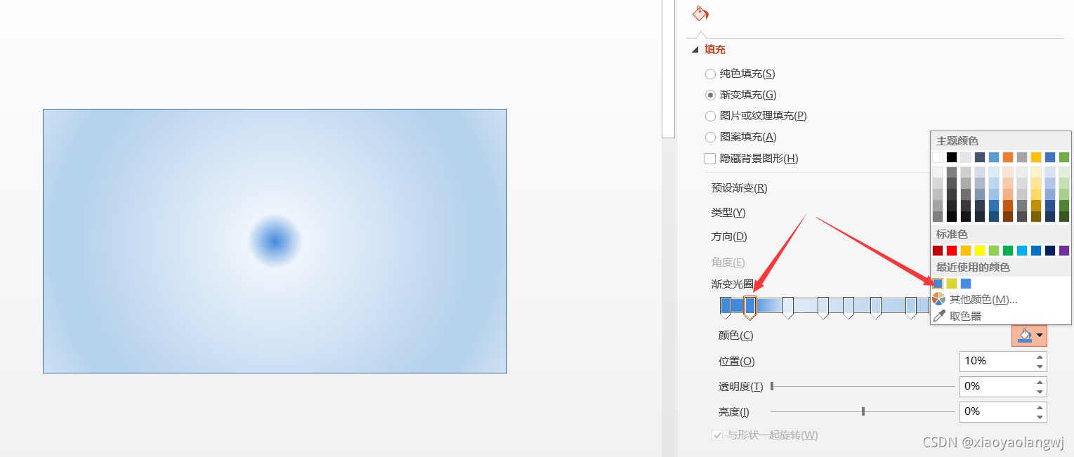 最左侧光圈设置(终点光圈颜色设置):【颜色】【其他颜色】打开调色盘调整出一个比较亮的蓝色(略带青色)