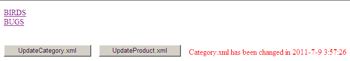 3)当点击[UpdateCategroy.xml] 或 [UpdateProduct.xml]按钮更新相应的xml文件,CacheDependency触发ASP.NET移除对应的缓存项,当缓存项被移除时,将通过CacheItemRemovedCallback 告知应用程序做出相应处理。此Demo中实现了重新从xml中读取数据更新缓存项的功能。从而实现了xml文件与缓存数据同步更新。