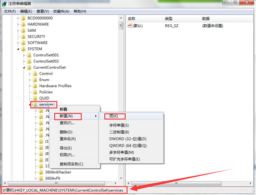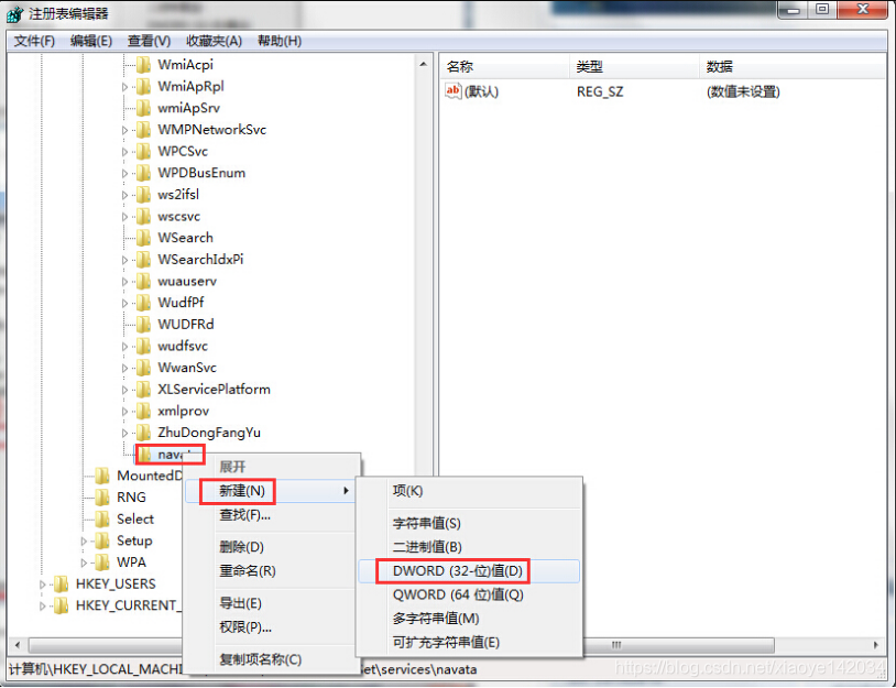 2.在打开的注册表编辑器窗口中,依次展开:HKEY_LOCAL_MACHINE→SYSTEM→CurrentControlSet→Services,然后右键Services项,新建一个子项名并命名为“nvata”。如下图所示