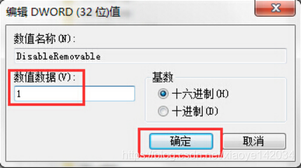 4.最后双击打开DisableRemovable值,在弹出的编辑DWORD值窗口中,将其数值数据改为“1”,然后点击确定完成操作。如下图所示