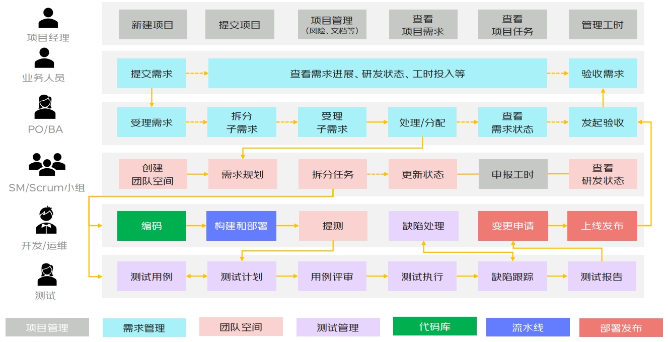 该平台为所有管理措施的落地提供了统一的工具和数据支撑。通过提供项目协作、开发、测试、运维等多个域的组件,彻底打通了不同职能团队之间的壁垒,实现了产研信息的一体化。