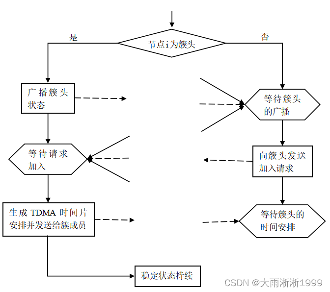 当选簇头广播簇头消息,非簇头节点根据接收信号的强度,选择强度最大的加入该簇。簇头节点采用时分多址(TDMA)方式安排时间间隙。