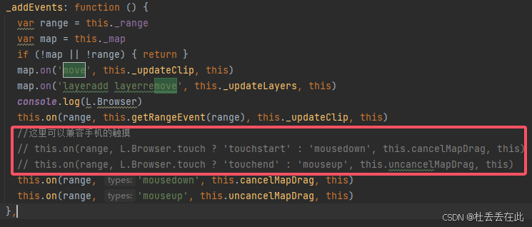 1.卷帘条拖不动:是leaflet工具原本的问题,工具在添加监听的地方,考虑到兼容手机触摸卷动,监听了touch事件,在pc端L.Browser.touch同样为真,触发了touch,没有正常触发mouse鼠标事件,所以就卡在那里了,把L.Browser.touch删掉或者换成L.Browser.mobile就行。