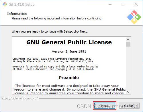 双击打开下载好的git安装包,出现GNU通用公共许可证内容,点击next