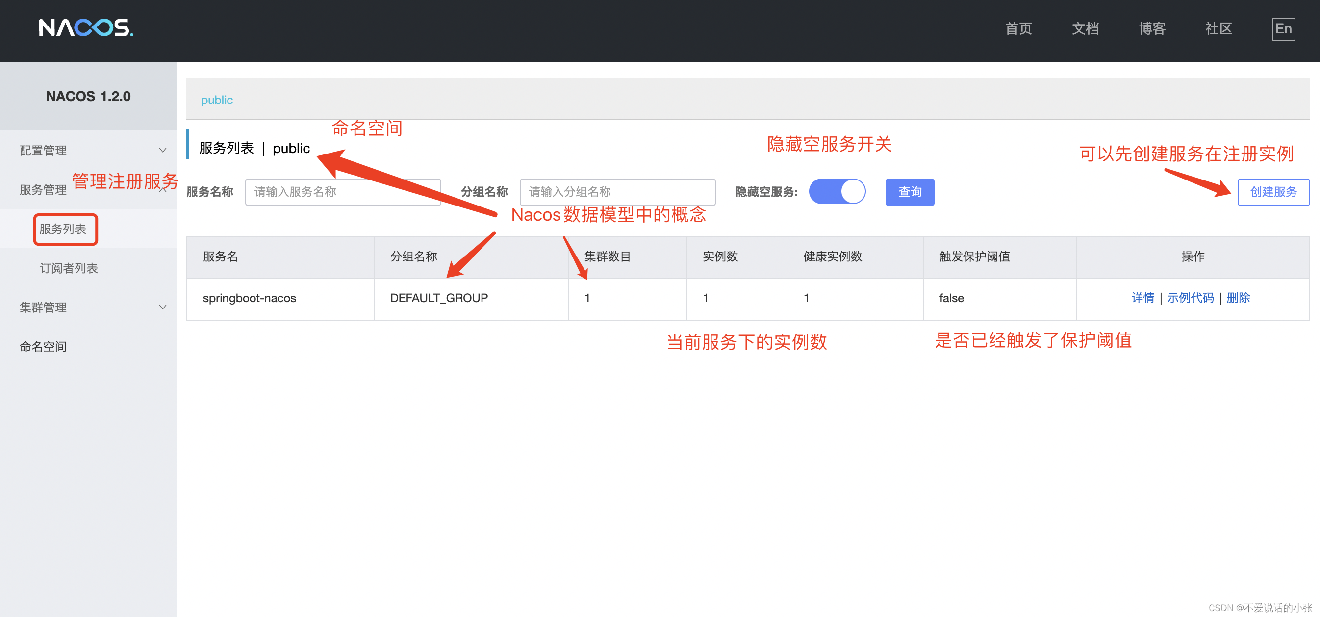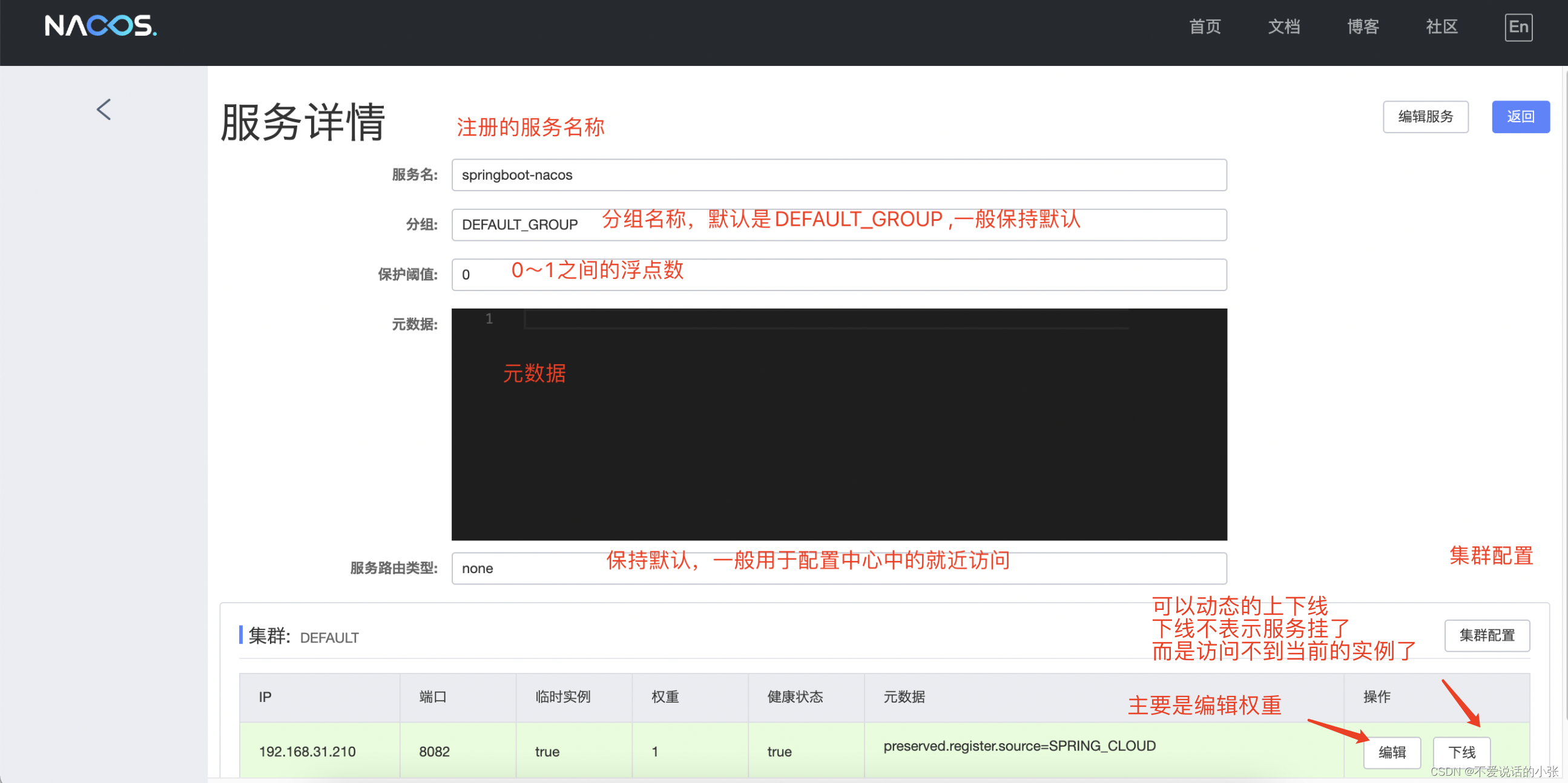 - 服务和元数据管理(管理平台的⻆度,nacos也有⼀个ui⻚⾯,可以看到注册的服务及其实例信息(元数据信息)等),动态的服务权重调整、动态服务优雅下线,都可以去做。