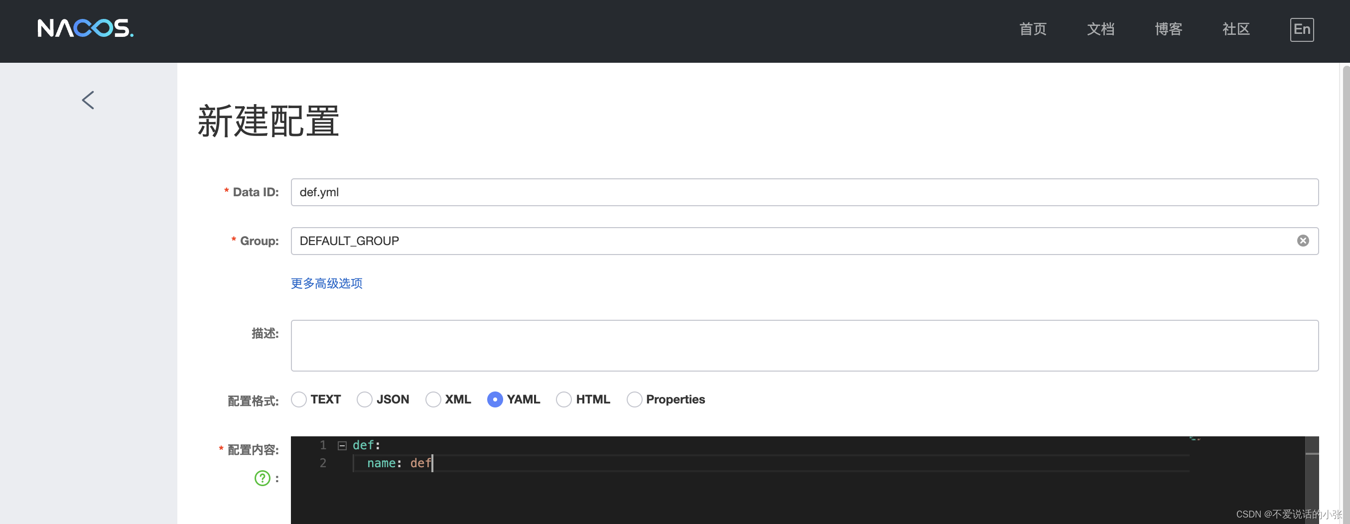 file-exetension 为配置内容的数据格式,可以通过配置项spring.cloud.nacos.config.file-extension 来配置。⽬前只⽀持properties 和 yaml 类型。