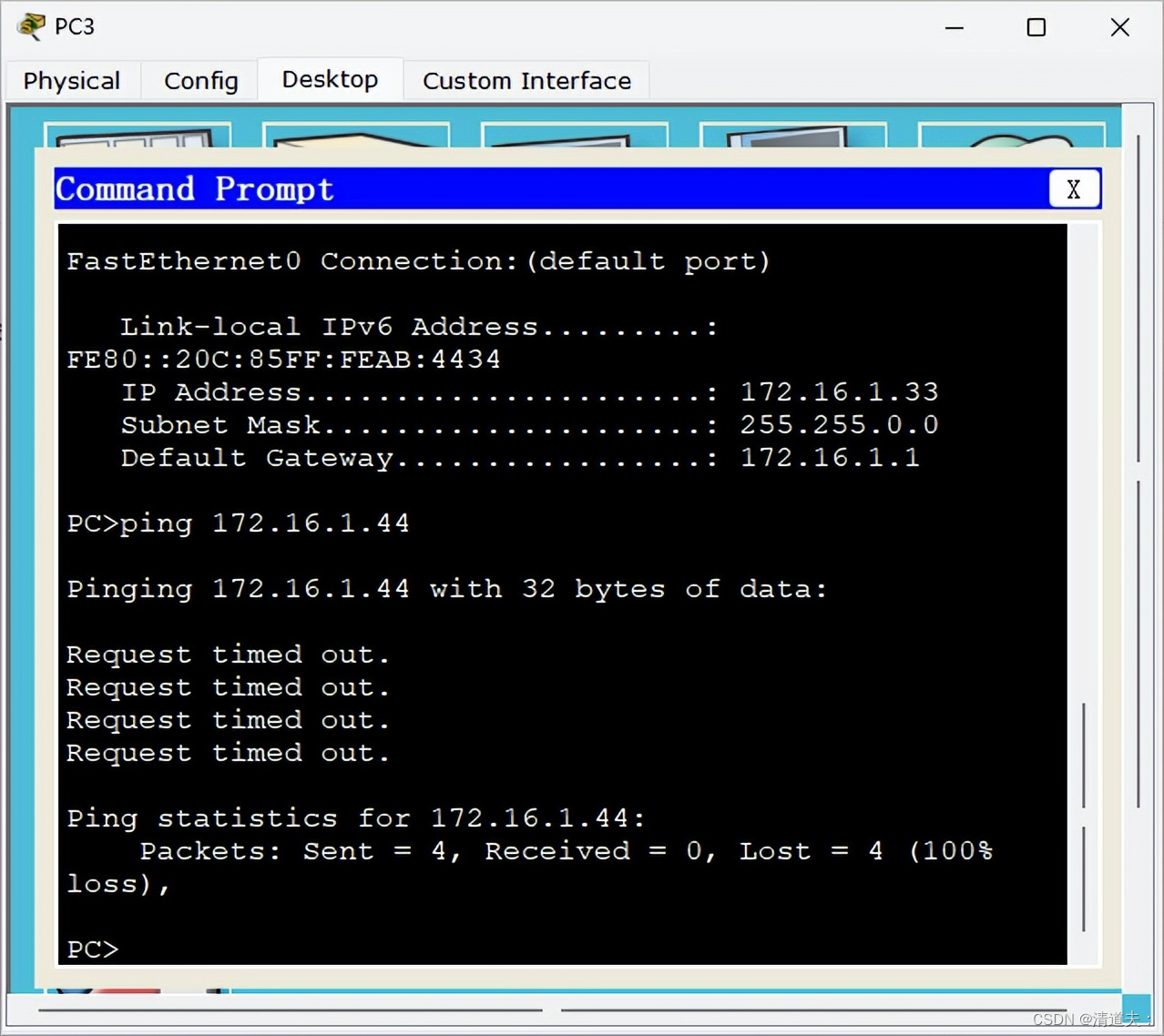 5.PC3接接switch_A的VLAN 11的1号端口,PC4接switch_B中VLAN 20 的11号端口,此时switch_A、switch_B没有划分VLAN,两台计算机之间的连通性测试如下图所示: