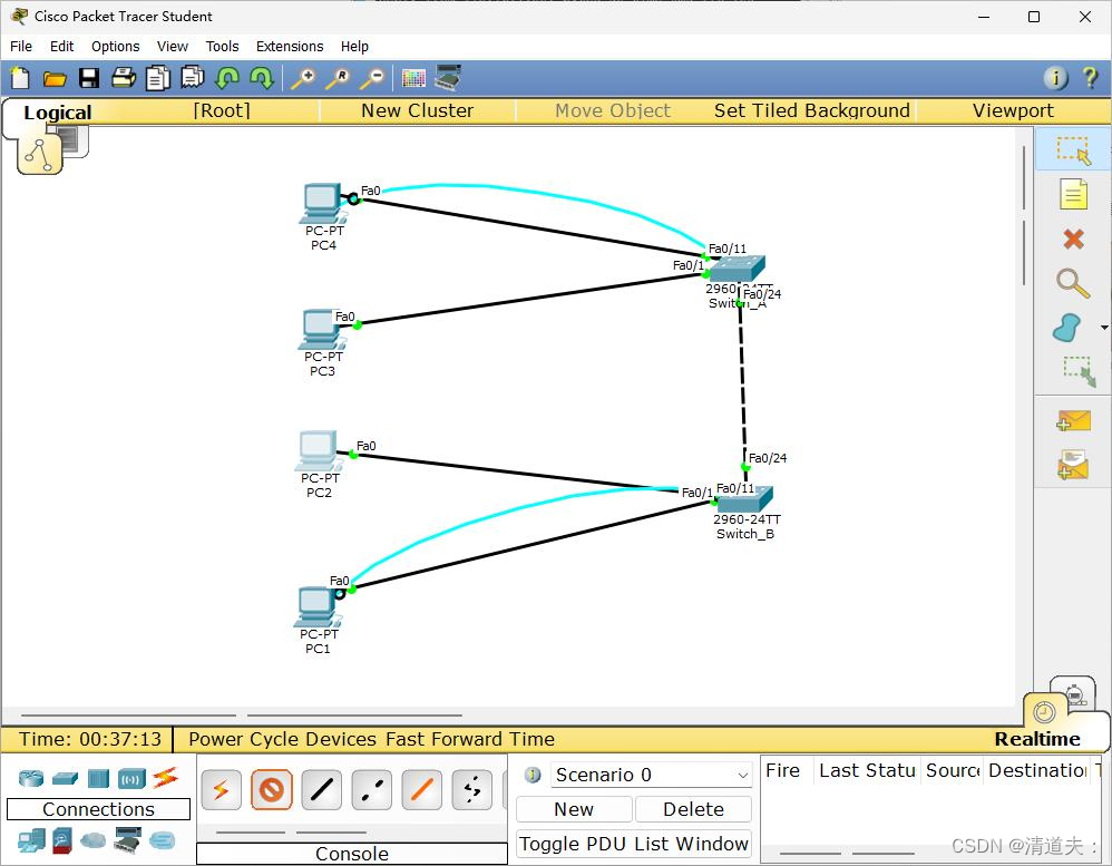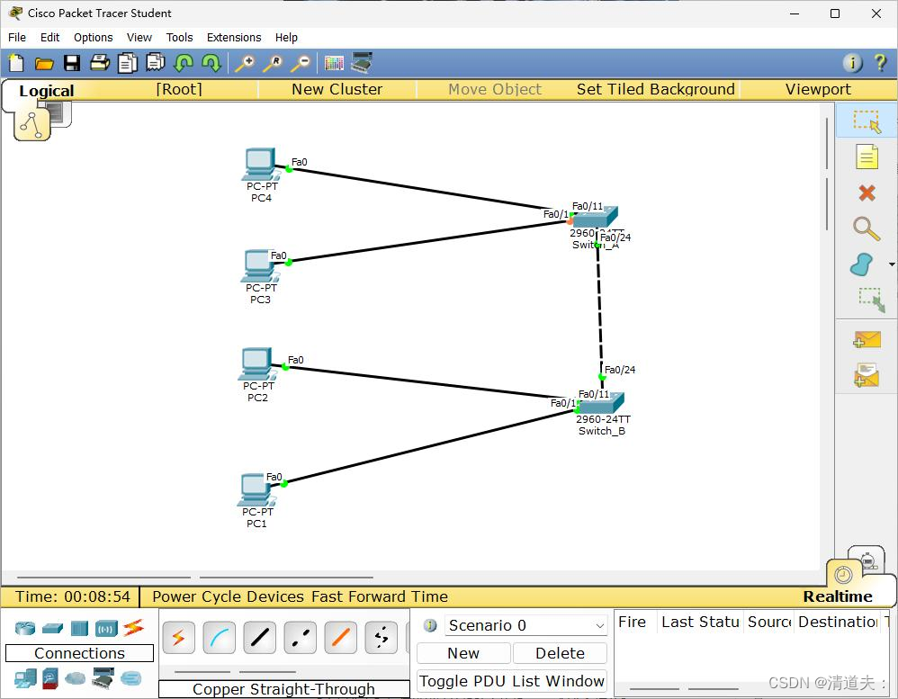为保证网络的正常稳定运行,网络技术人员采用VLAN技术实现技术部和市场部网络隔离,针对技术部、市场计算机跨交换机接入网络情况,且满足相同部门(相同VLAN)的计算机相互访问,不同部门(不同VLAN)的计算机不能通信。使用Cisco Packet Tracer Student 6.2 如何模拟计算机跨交换机VLAN划分和通信呢?