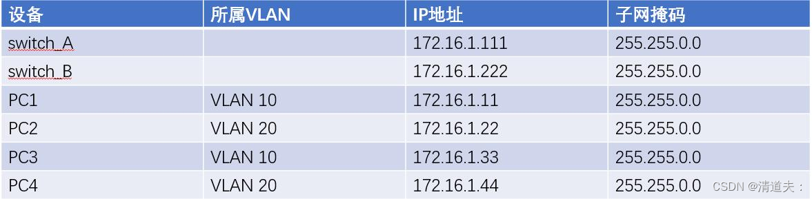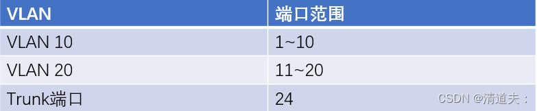 1.在switch_A和switch_B上分别划分两个基于端口的VLAN 10和VLAN 20。通过交叉双绞线连接switch_A和switch_B的24k号端口,采用交换机级联,并将交换机24端口设置为trunk,端口规划表如下表所示: