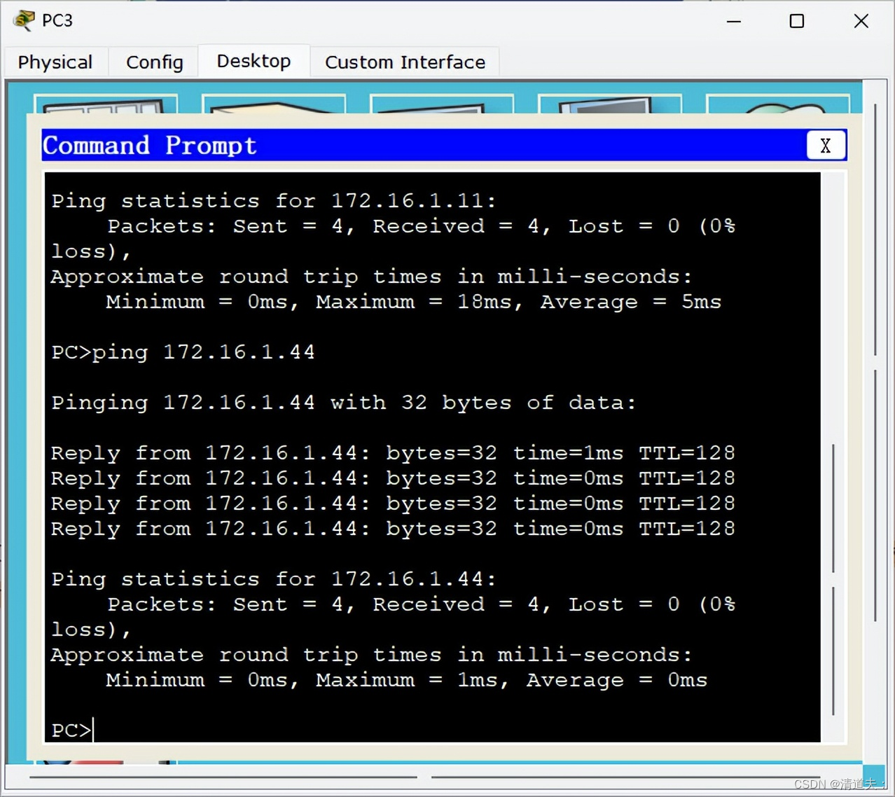 6.PC1接接switch_A的VLAN 11的1号端口,PC2接switch_B中VLAN 20 的11号端口,此时switch_A、switch_B没有划分VLAN,两台计算机之间的连通性测试如下图所示: