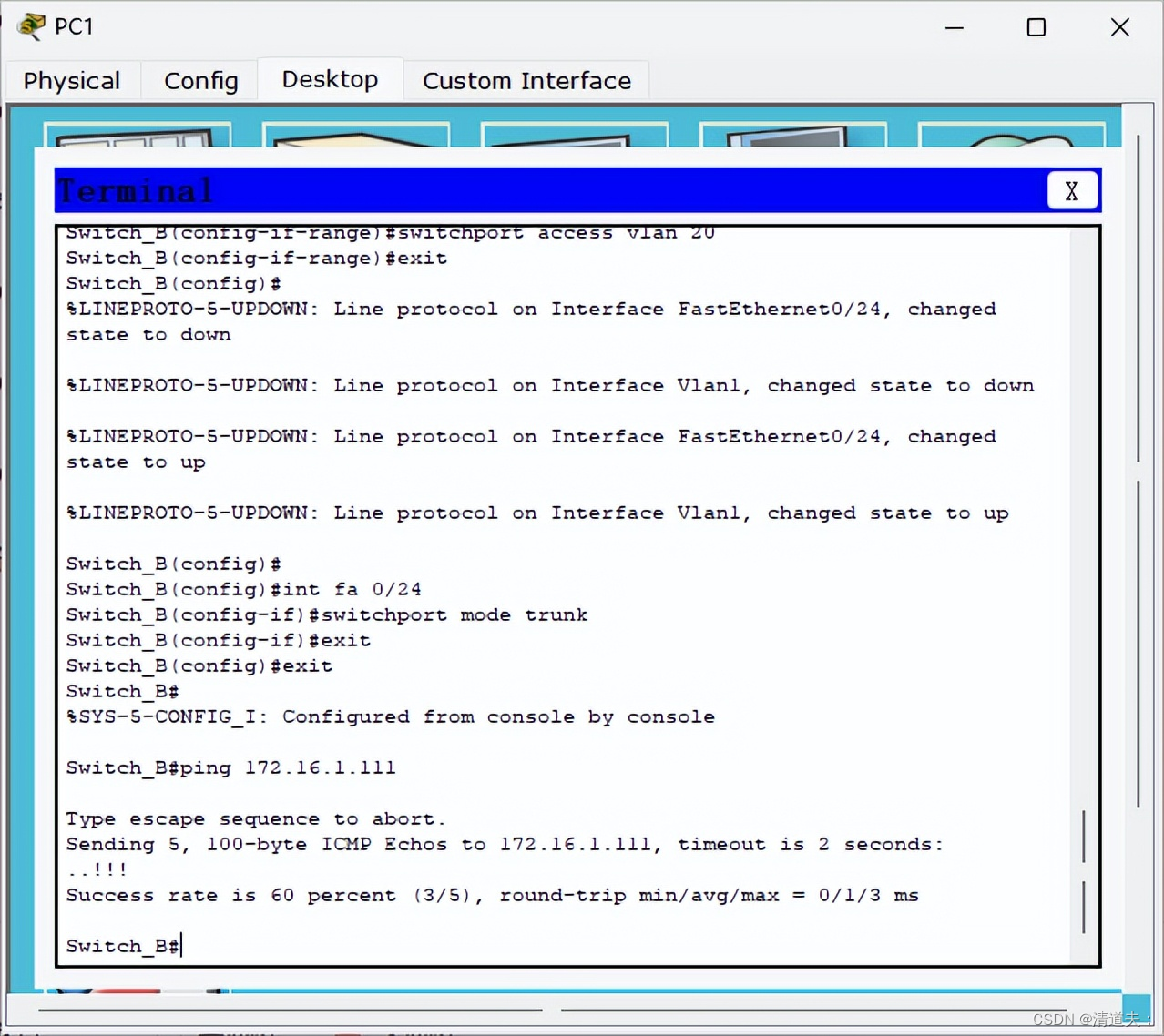 7.给switch_B的24号端口设置为trunk端口,命令如下: