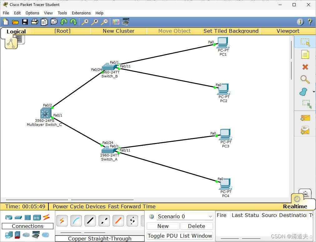 本案例设备需要三层交换机(3560)1台,二层交换机(2960)1台,主机4台(PC1、PC2、PC3、PC4),Console配置线2根,直通双绞线和交叉双绞线若干。使用Cisco Packet Tracer Student 6.2搭建的网络拓扑结构图如下图所示: