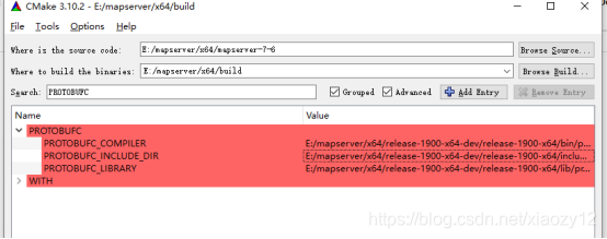 在Seach输入PROTOBUFC,可以看到PROTOBUFC_COMPILER和PROTOBUFC_INCLUDE_DIR这两个变量找不到值,这里我们只能去手动添加: