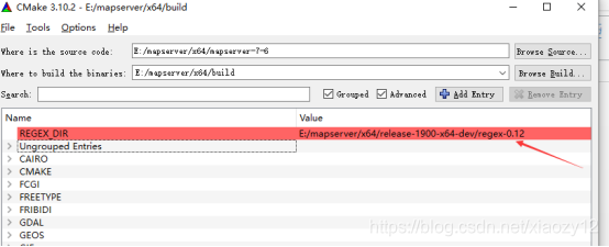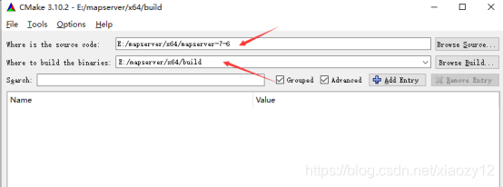 打开Cmake-gui界面,分别输入mapserver源码路径和构建的VS工程的输出路径: