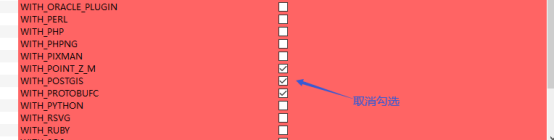 因为我本机没有搞postgis数据库,依赖包也没有这个文件,所以我们可以在WITH下找到WITH_POSTGIS,取消勾选: