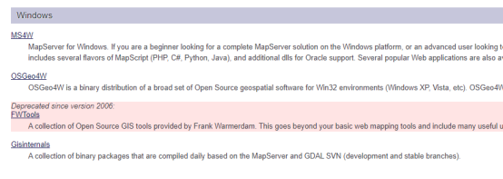 在编译之前,要先下载好mapserver源码包以及mapserver的依赖库。官网中可以下载到源码包,同时官网也给出了三个渠道下载第三方库,分别是MS4W,OSGeo4W和Gisinternals(FWTools官方表示已经弃用),如下图: