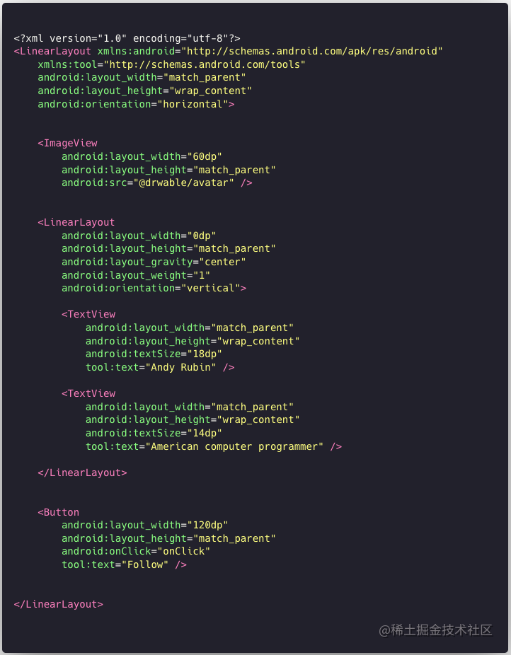 普通的 Android View 也可以使用 DSL 进行描述。下面是一个简单的 UI 布局,左边是其对应的 XML 代码,右边是我们为其设计的 Kotlin DSL 代码