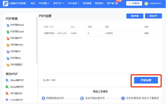 先上传文档到空白处,等文档上传完成后就可以开始设置密码了。