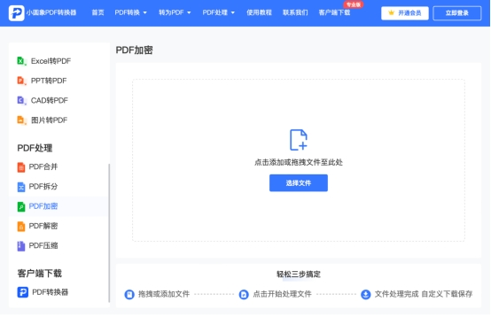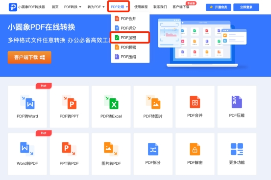 进入官网后点击首页菜单栏的【PDF处理】,下拉的【PDF加密】就是我们所需要的。