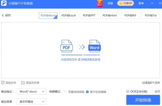 第二步:点击添加文件或者拖拽添加到此区域,上传完毕后,我们需要调整转换模式,可以默认易于后续编辑,也可以改成尽量保持排版,输出目录可以默认原文件路径也可以自定义路径,最后点击开始转换就可以了!