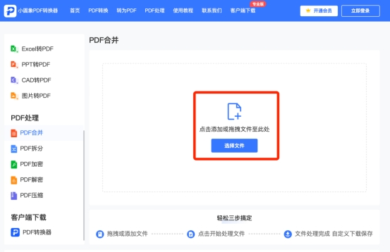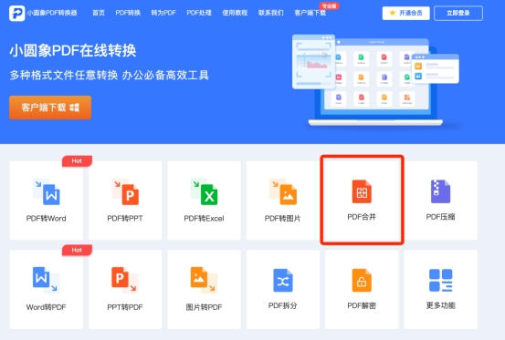 如果你嫌下载软件太麻烦,用小圆象PDF转换器就可以直接在线合并了。操作网站:https://www.xiaoyuanxiang.cn 网页的首页上可以看到多种与PDF有关的服务,包括转换PDF为其他格式文档,PDF合并拆分、PDF加密解密等,我们点击【PDF合并】选项后进行下一步操作。