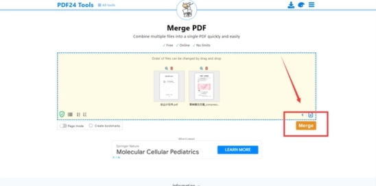 文档上传后可以看到PDF的页面缩略图,更方便我们确认文档顺序。最后点击右下角的【Merge】按钮,这样两个文档就能顺利合成一个了。