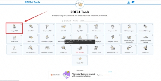 这是小编发现的另一个超实用的处理PDF网站,名叫【PDF24tools】,通过浏览器搜索就能找到该网站。它是一个外文网站,下面就给大家简单介绍一下这上面合并PDF的流程。首先点击【Merge PDF】选项,接着进行文档上传。