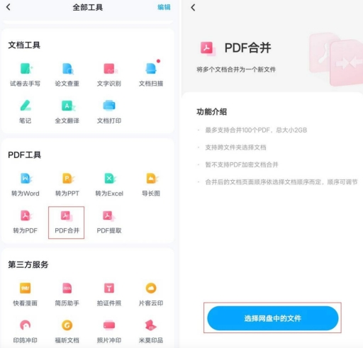 很多小伙伴生活中都会用到百度网盘,但一般就用来储存东西和看视频,这上面有处理文档的功能都不知道。使用该功能之前需要先将两个PDF上传到百度网盘上,然后点击【全部工具】中的【PDF工具】,选择网盘中的文件,这样就可以把选中的两个PDF合为一个了。